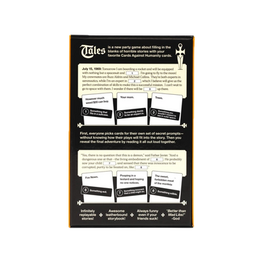 Tales is a storytelling-based party game that incorporates cards from Cards Against Humanity. Players use their cards to fill in blanks within prewritten story templates, creating humorous or unexpected narratives.
