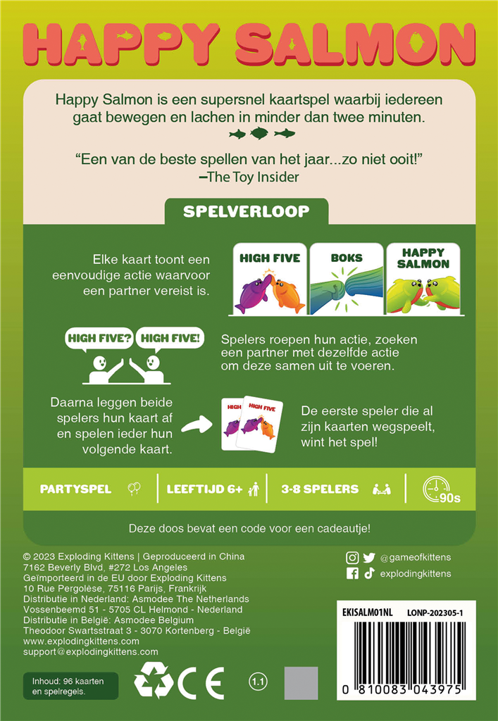 Tijdens een potje Happy Salmon probeer je zo snel mogelijk van je kaarten af te komen door een andere speler te vinden die dezelfde actie moet uitvoeren. Heb je die gevonden, dan voeren jullie de actie samen uit. Daarna mogen jullie de kaarten afleggen. Zo geef je elkaar high fives, de vuist, de enige echte Happy Salmon move of wissel je met elkaar van plaats. Wie in deze chaos als eerste zijn kaarten kwijt is, wint!