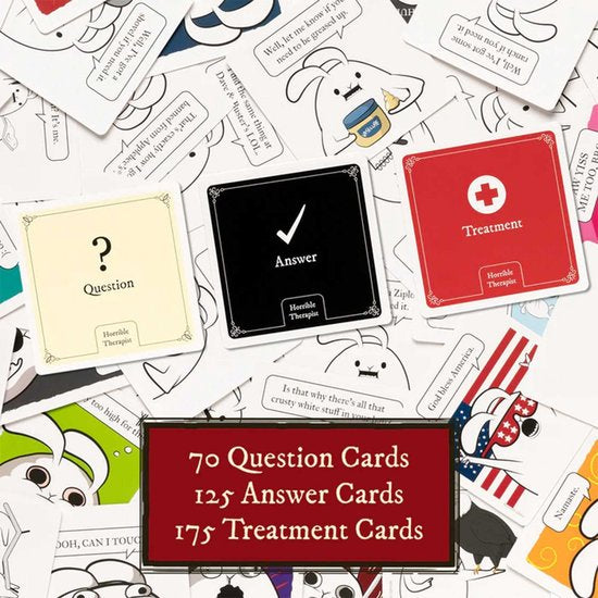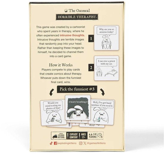 Therapy can be horrible so we made a game about it.Playing is easy. You’ll make 3 panel comics about it with your friends. You’ll laugh. You’ll gasp. You’ll be mildly offended (in a fun way). But ultimately, you’ll feel great when your intrusive thoughts help you win this adult card game! Perfect for pregaming, parties, or any situation where you need to get rowdy with a group.